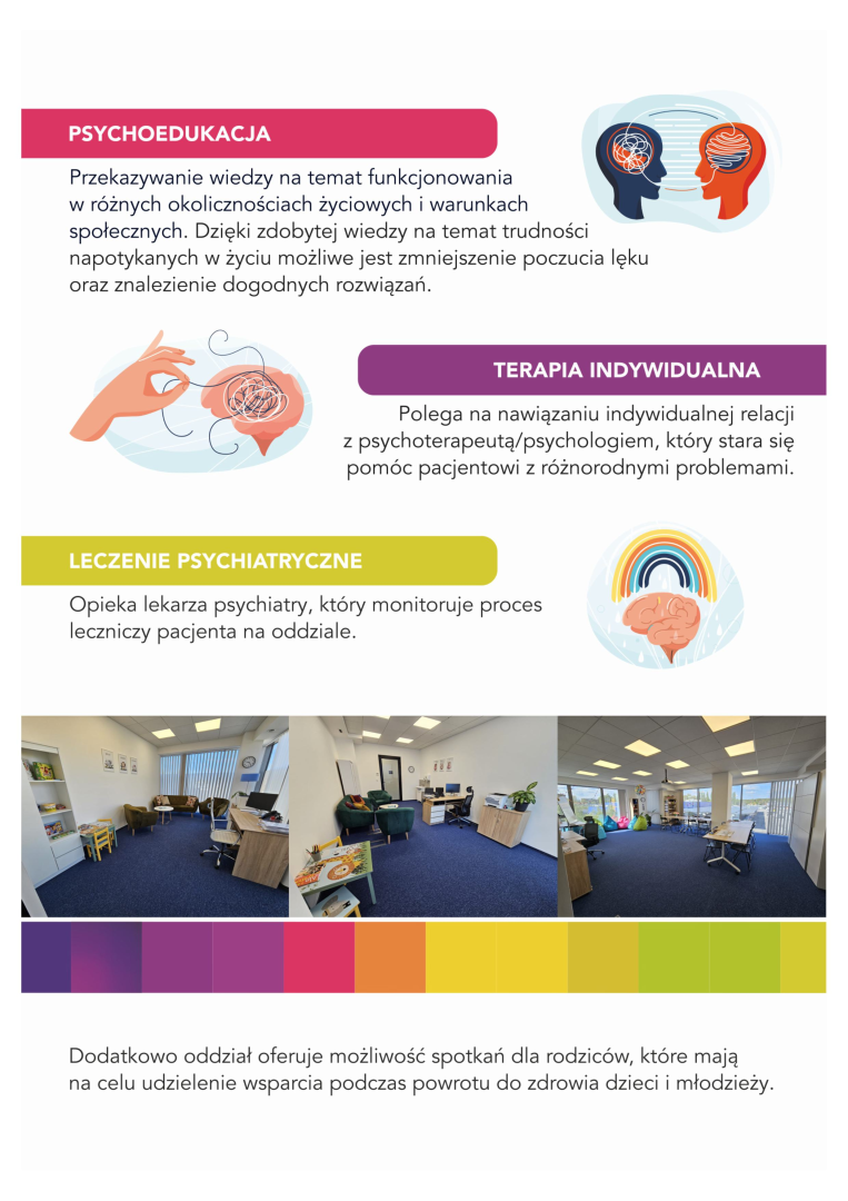 Oddziały przeznaczone są do kompleksowego diagnozowania i leczenia młodzieży z zaburzeniami psychicznymi takimi jak: zaburzenia osobowości. lęki, depresja, zaburzenia zachowania i emocji, trudności w komunikacji społecznej, zaburzenia wynikające z sytuacji rodzinnej lub szkolnej itp.