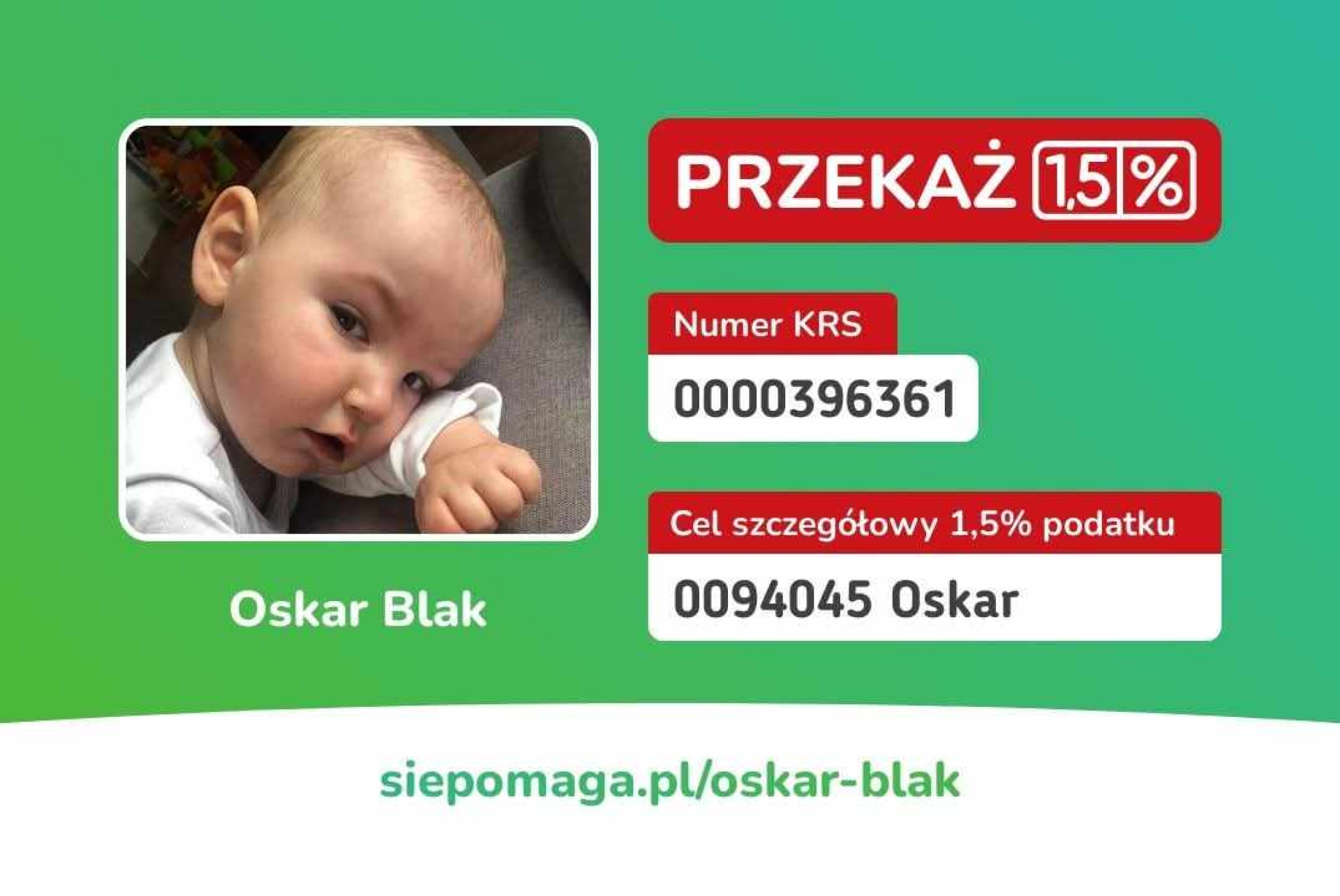 - Oskar Blak – KRS 0000387207 – Fundacja Serca dla Maluszka, cel szczegółowy 1,5%: 0094045 Oskar - www.siepomaga.pl