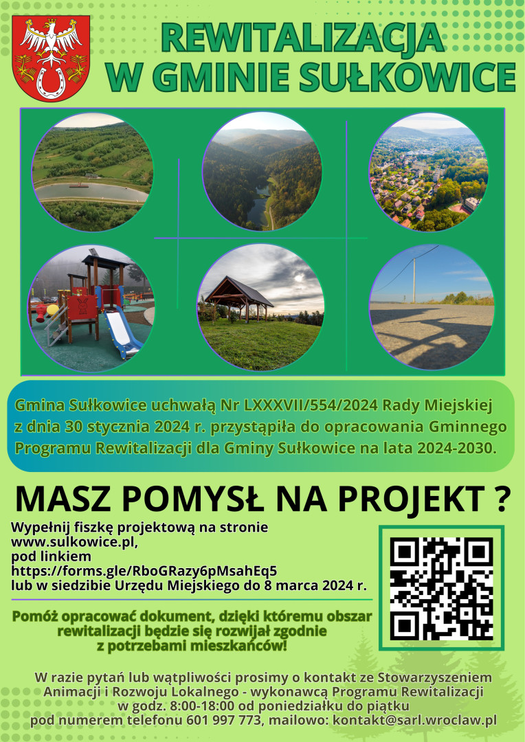 Gmina Sułkowice uchwałą Nr LXXXVII/554/2024 Rady Miejskiej z dnia 30 stycznia 2024 r. przystąpiła do opracowania Gminnego Programu Rewitalizacji dla Gminy Sułkowice na lata 2024-2030. Gminny Program Rewitalizacji ma na celu poprawę jakości życia mieszkańców, zwiększenie atrakcyjności obszaru dla inwestorów oraz turystów, ochronę dziedzictwa kulturowego oraz środowiska naturalnego. Program ustala także priorytety działań, takie jak remonty i modernizacje infrastruktury, rewitalizacja zabytków, poprawa dostępności terenów zieleni, czy programy aktywizacji społecznej i edukacyjnej. Zapraszamy do uzupełnienia fiszek projektowych do dnia 8 marca 2024 r. Prosimy wszystkie osoby i instytucje oddane sprawie poprawy jakości życia w naszej Gminie o aktywne włączenie się do Programu i opisanie swojego pomysłu, propozycji projektu zgodnie z zaproponowaną poniżej fiszką projektową. Zgłoszony projekt będzie wzięty pod uwagę i rozważony do włączenia do Programu Rewitalizacji. Wobec faktu, iż Gminny Program Rewitalizacji stanowi wynik propozycji, pomysłów wszystkich partnerów biorących udział w procesie rewitalizacji, niezbędne jest zebranie dobrych pomysłów na projekty.