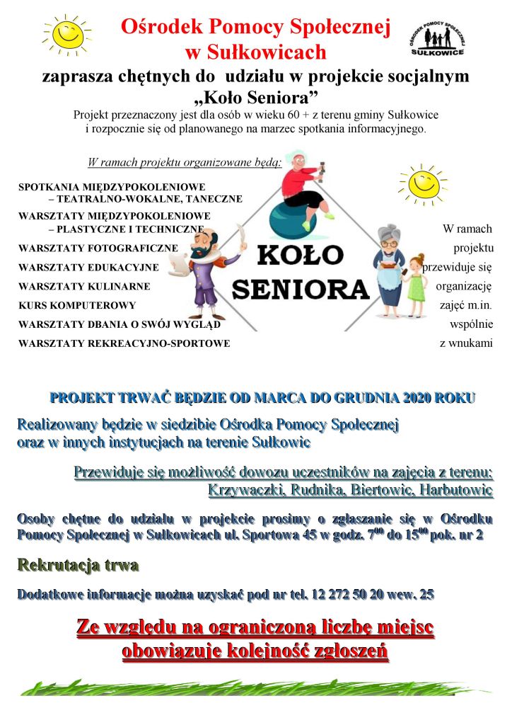 Ośrodek Pomocy Społecznej w Sułkowicach zaprasza chętnych do wzięcia udziału w projekcie socjalnym "Koło Seniora", który trwać będzie od marca do grudnia 2020 r.