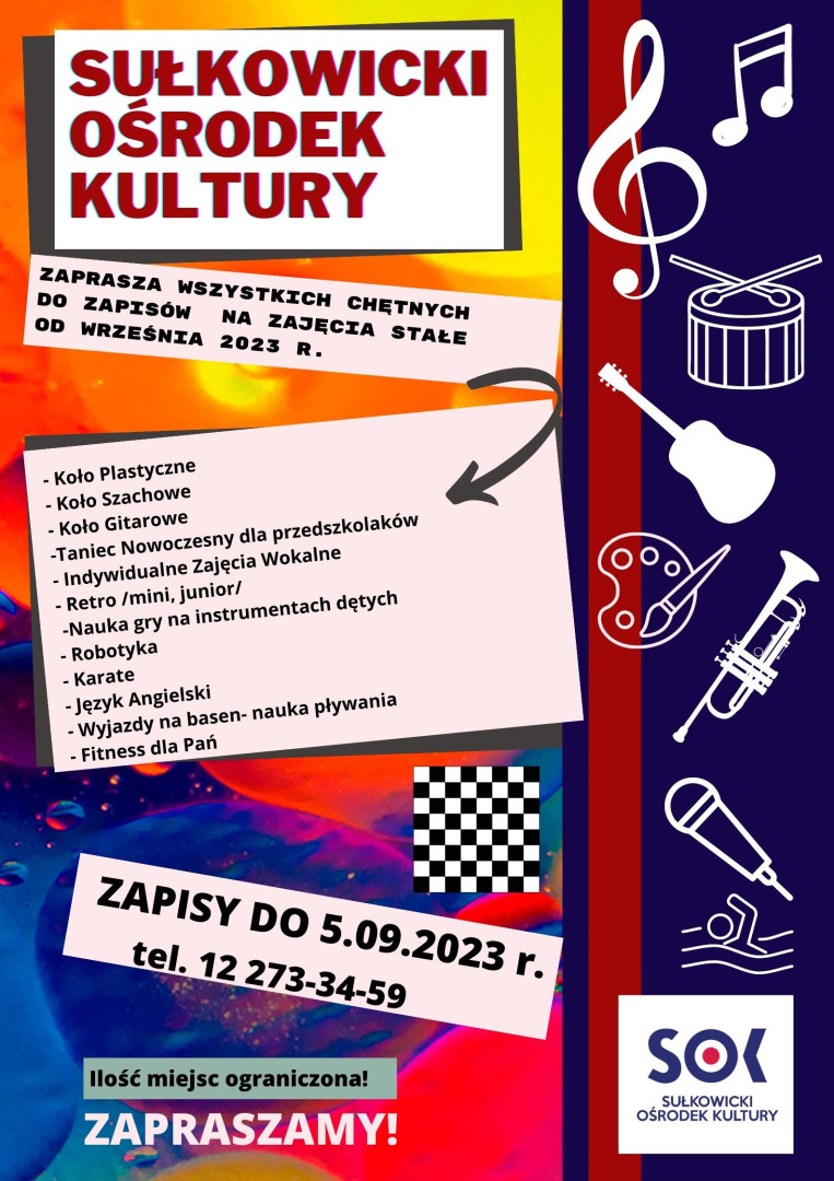 Sułkowicki Ośrodek Kultury zaprasza wszystkich chętnych do zapisów na zajęcia stałe, od września 2023 r.