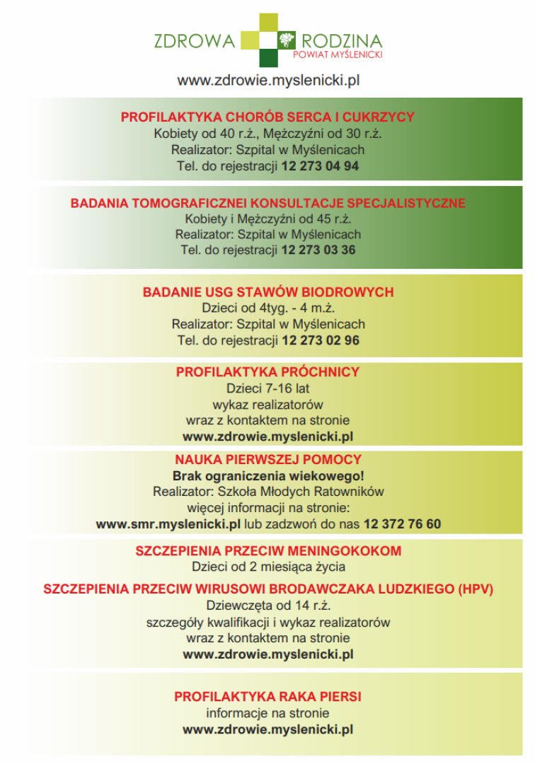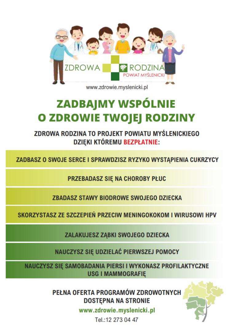 ZDROWA RODZINA - projekt realizowany przez Powiat Myślenicki skupiający się na profilaktyce najczęściej występujących chorób cywilizacyjnych, chorób zakaźnych, edukacji i promocji zdrowia skierowanego do całych rodzin. Celem działań jest poprawa zdrowia i jakości życia mieszkańców naszego powiatu, a także wzrost świadomości na temat zagrożeń zdrowotnych oraz metod ich zapobiegania.