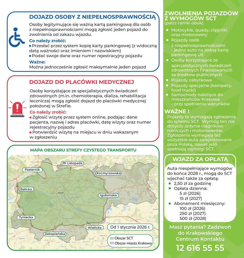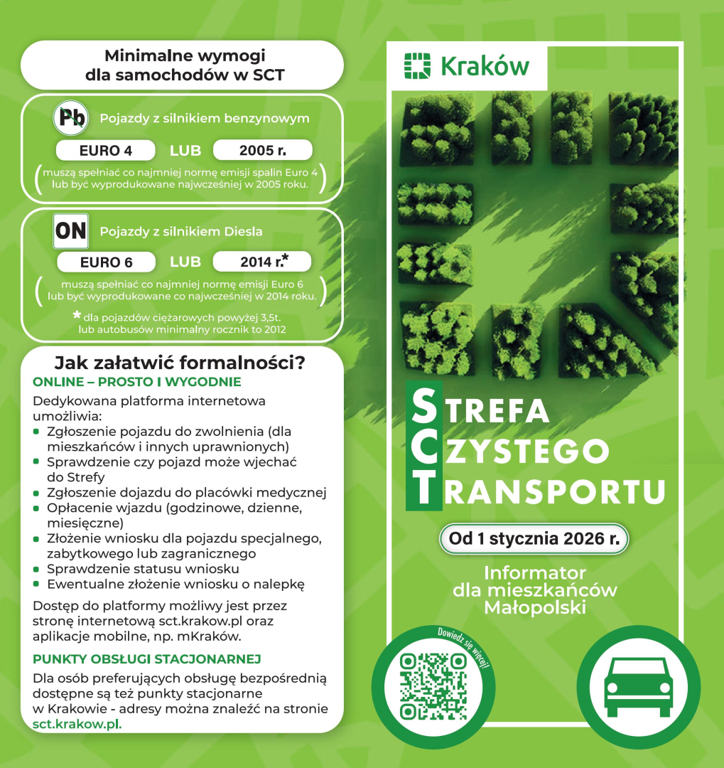 Głównym źródłem informacji o Strefie Czystego Transportu jest strona internetowa sct.krakow.pl, na której znajdziesz aktualności, szczegółowe wyjaśnienia przepisów, instrukcje krok po kroku oraz odpowiedzi na najczęściej zadawane pytania. Jeśli potrzebujesz dodatkowych wyjaśnień lub indywidualnego wsparcia, należy kontaktować się z Krakowskim Centrum Kontaktu – mailowo lub telefonicznie, pod numerem 12 616 55 55.