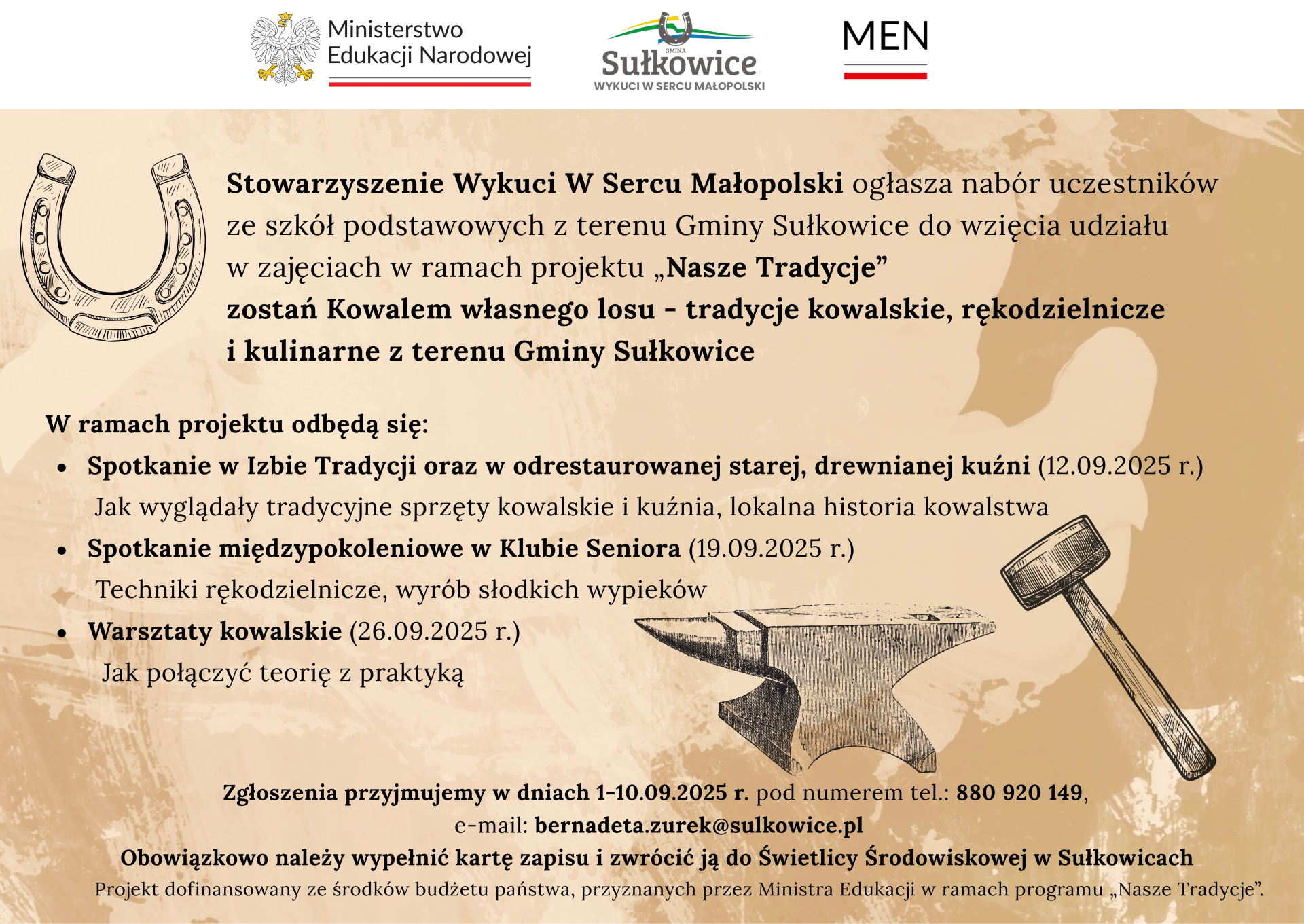 Stowarzyszenie Wykuci W Sercu Małopolski ogłasza nabór uczestników ze szkół podstawowych z terenu Gminy Sułkowice do wzięcia udziału w zajęciach w ramach projektu „Nasze Tradycje” zostań Kowalem własnego losu - tradycje kowalskie, rękodzielnicze i kulinarne z terenu Gminy Sułkowice.