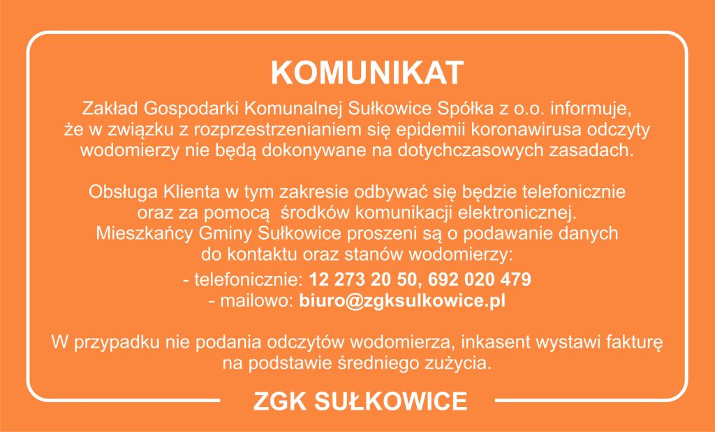 Zakład Gospodarki Komunalnej Sułkowice Spółka z o.o. informuje, że w związku z rozprzestrzenianiem ssie epidemii koronawirusa odczyty wodomierzy nie będą dokonywane na dotychczasowych zasadach.