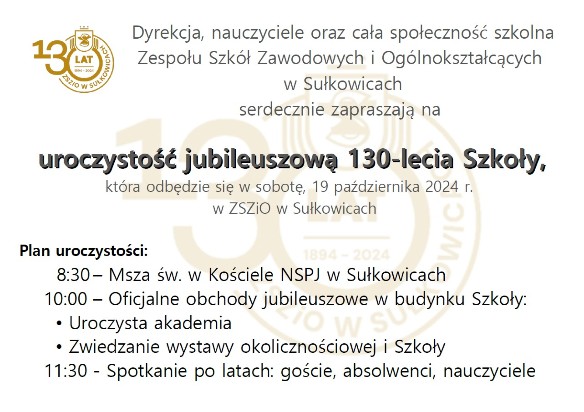 Przypominamy o jubileuszu 130-lecia Zespołu Szkół Zawodowych i Ogólnokształcących w Sułkowicach.