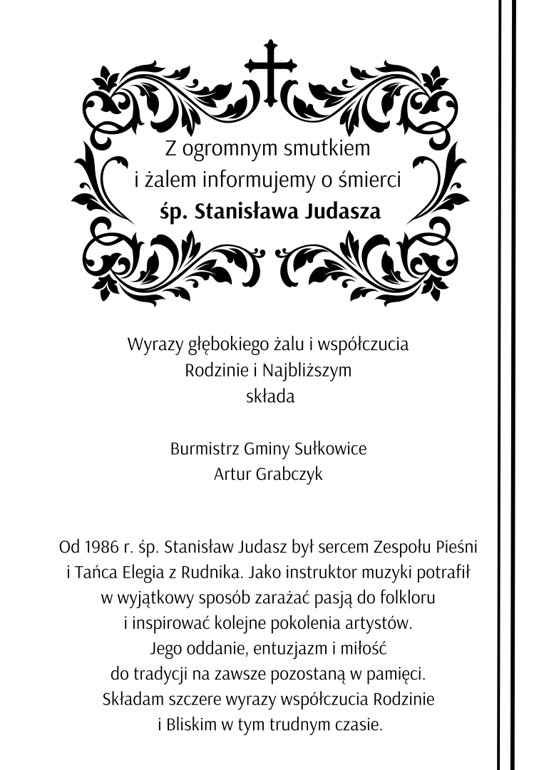 W dniu 27 listopada 2024 r. zmarł śp. Stanisław Judasz - Kondolencje od Burmistrza Gminy Sułkowice