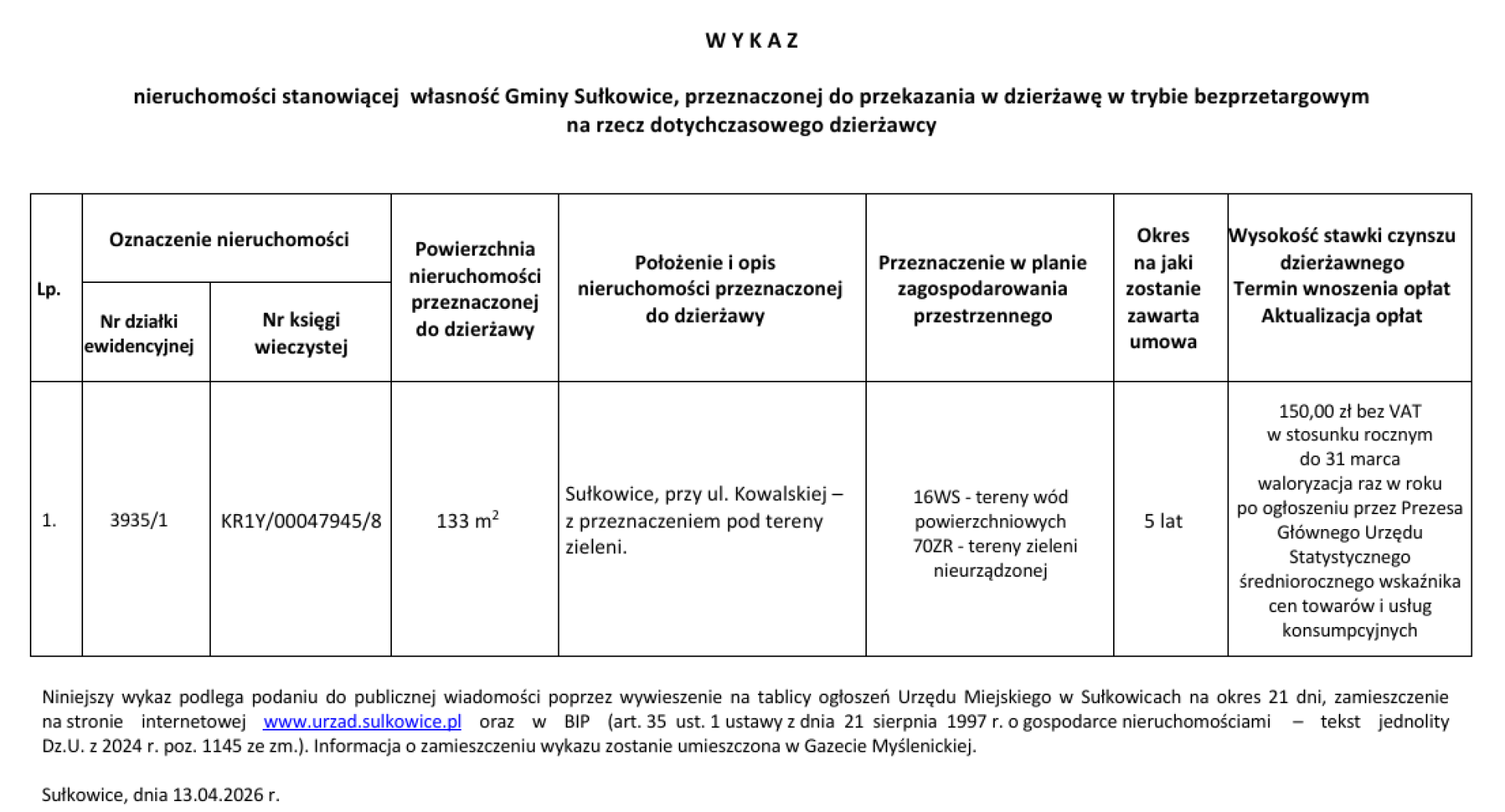 W Y K A Z nieruchomości stanowiącej własność Gminy Sułkowice, przeznaczonej do przekazania w dzierżawę w trybie bezprzetargowym na rzecz dotychczasowego dzierżawcy - przy ul. Kowalskiej
