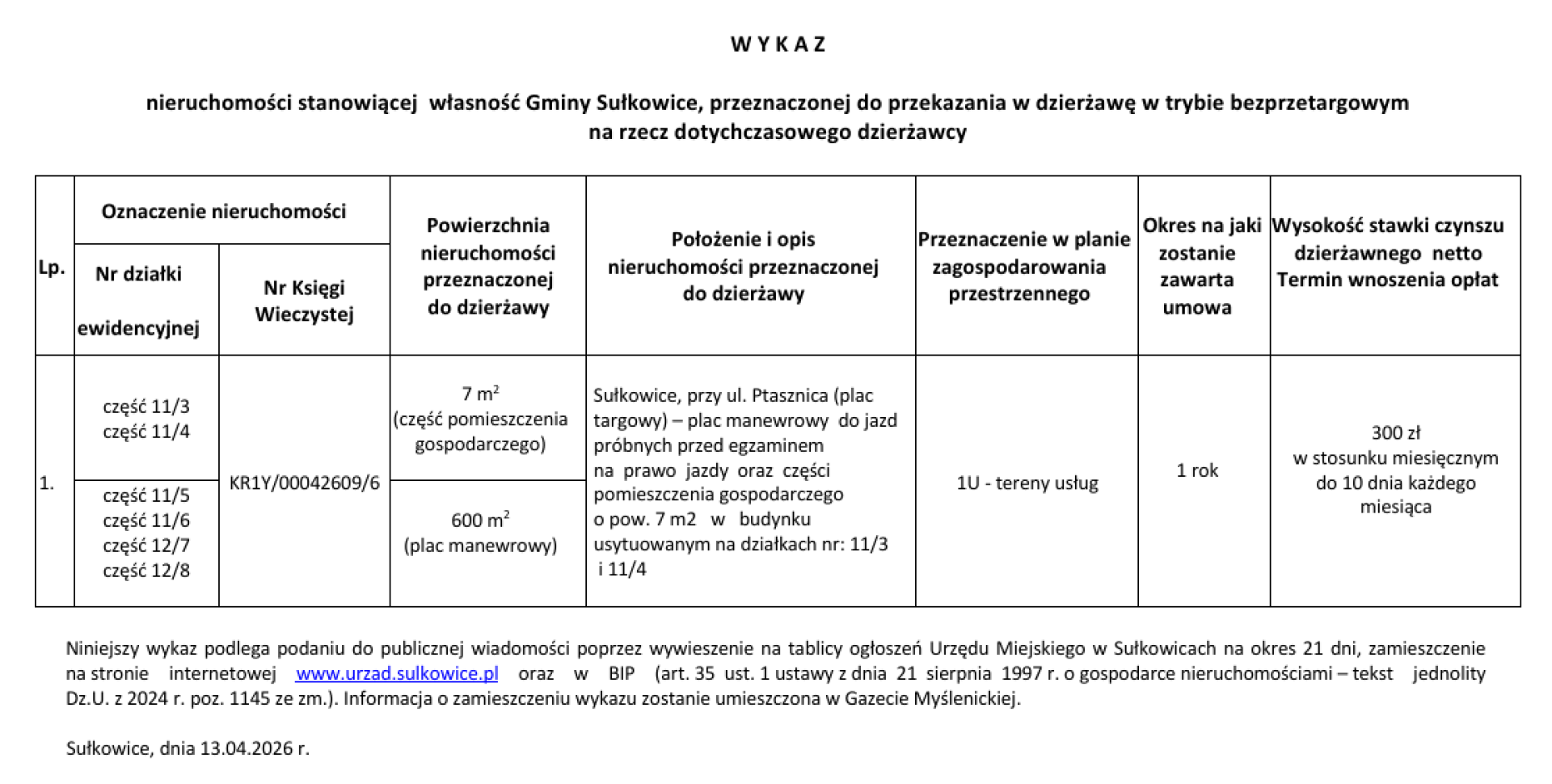 W Y K A Z nieruchomości stanowiącej własność Gminy Sułkowice, przeznaczonej do przekazania w dzierżawę w trybie bezprzetargowym na rzecz dotychczasowego dzierżawcy - ul. Ptasznica