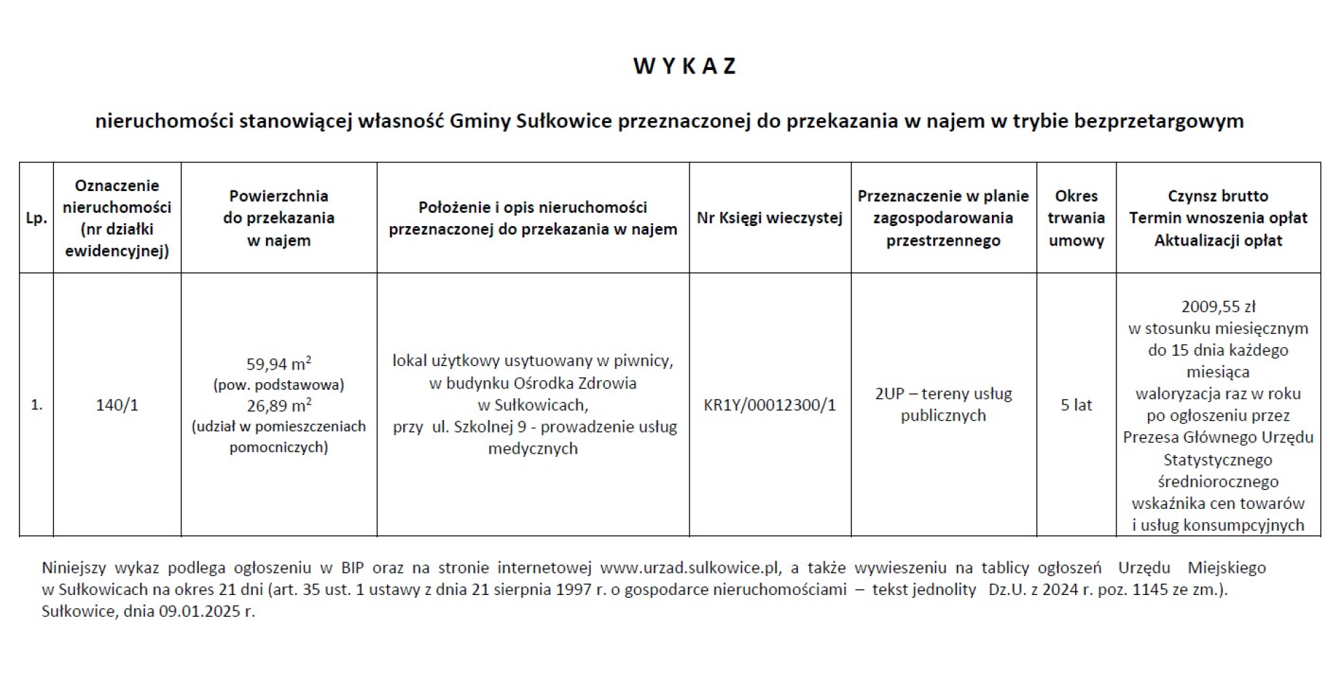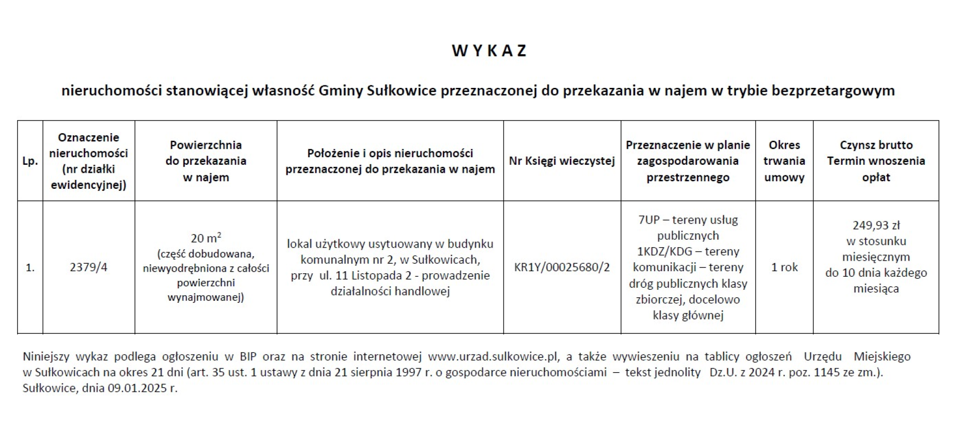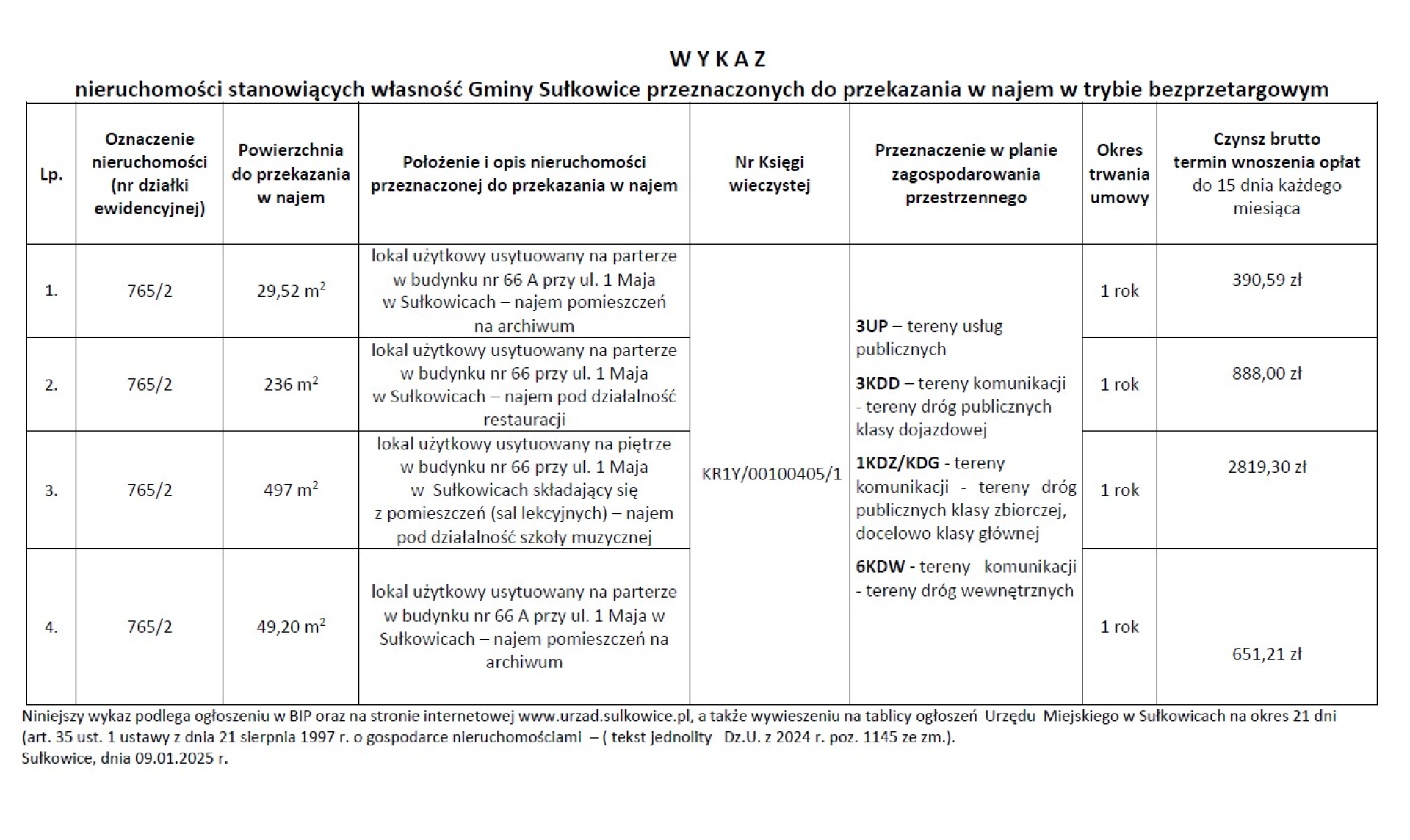 W Y K A Z nieruchomości stanowiącej własność Gminy Sułkowice przeznaczonej do przekazania w najem w trybie bezprzetargowym ul. 1 Maja , 11 listopada, Szkolna