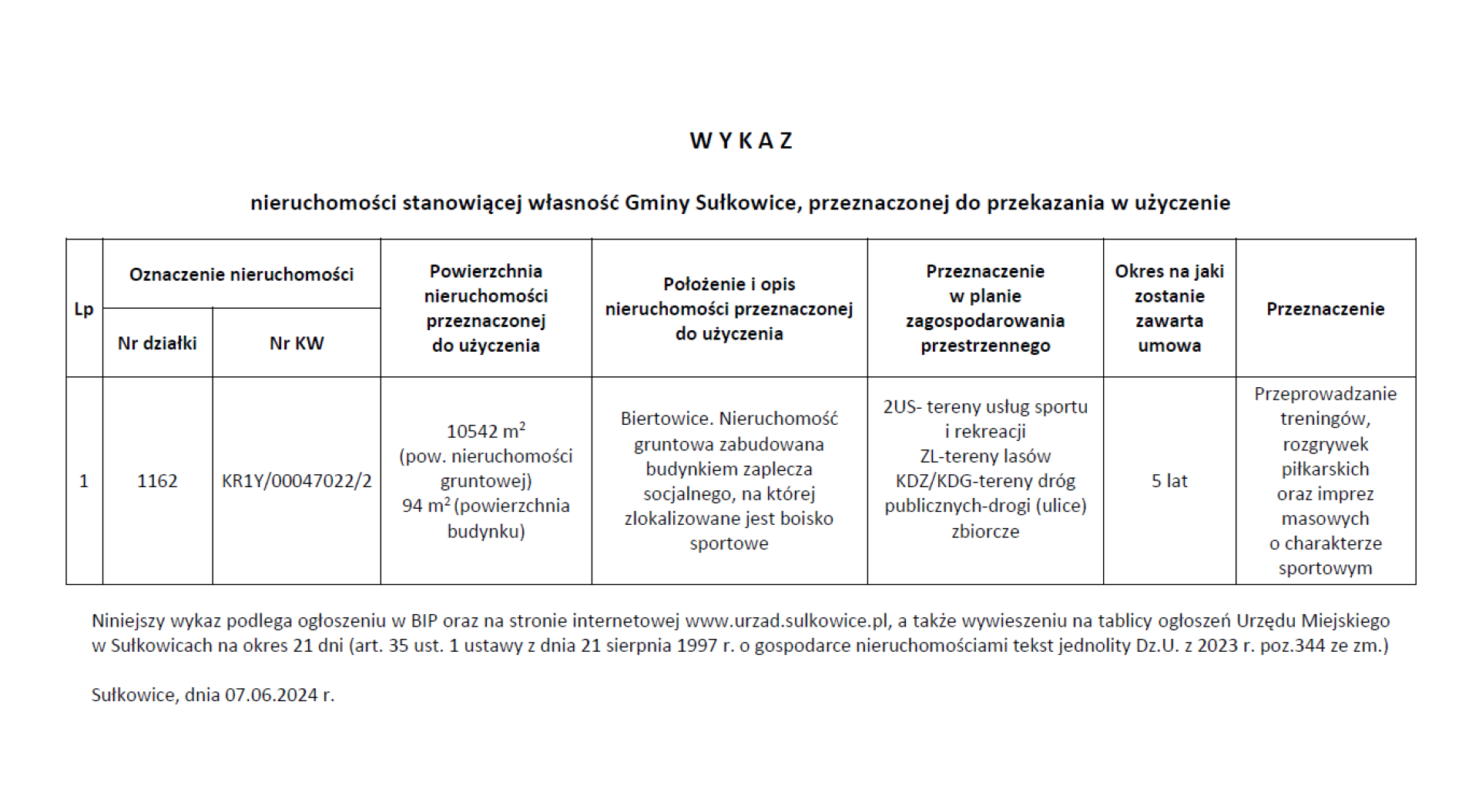 W Y K A Z nieruchomości stanowiącej własność Gminy Sułkowice, przeznaczonej do przekazania w użyczenie - Biertowice