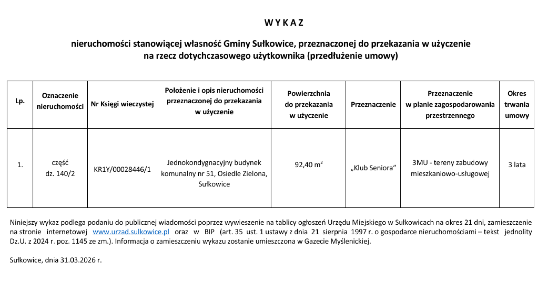 W Y K A Z nieruchomości stanowiącej własność Gminy Sułkowice, przeznaczonej do przekazania w użyczenie na rzecz dotychczasowego użytkownika (przedłużenie umowy) - Osiedle Zielona
