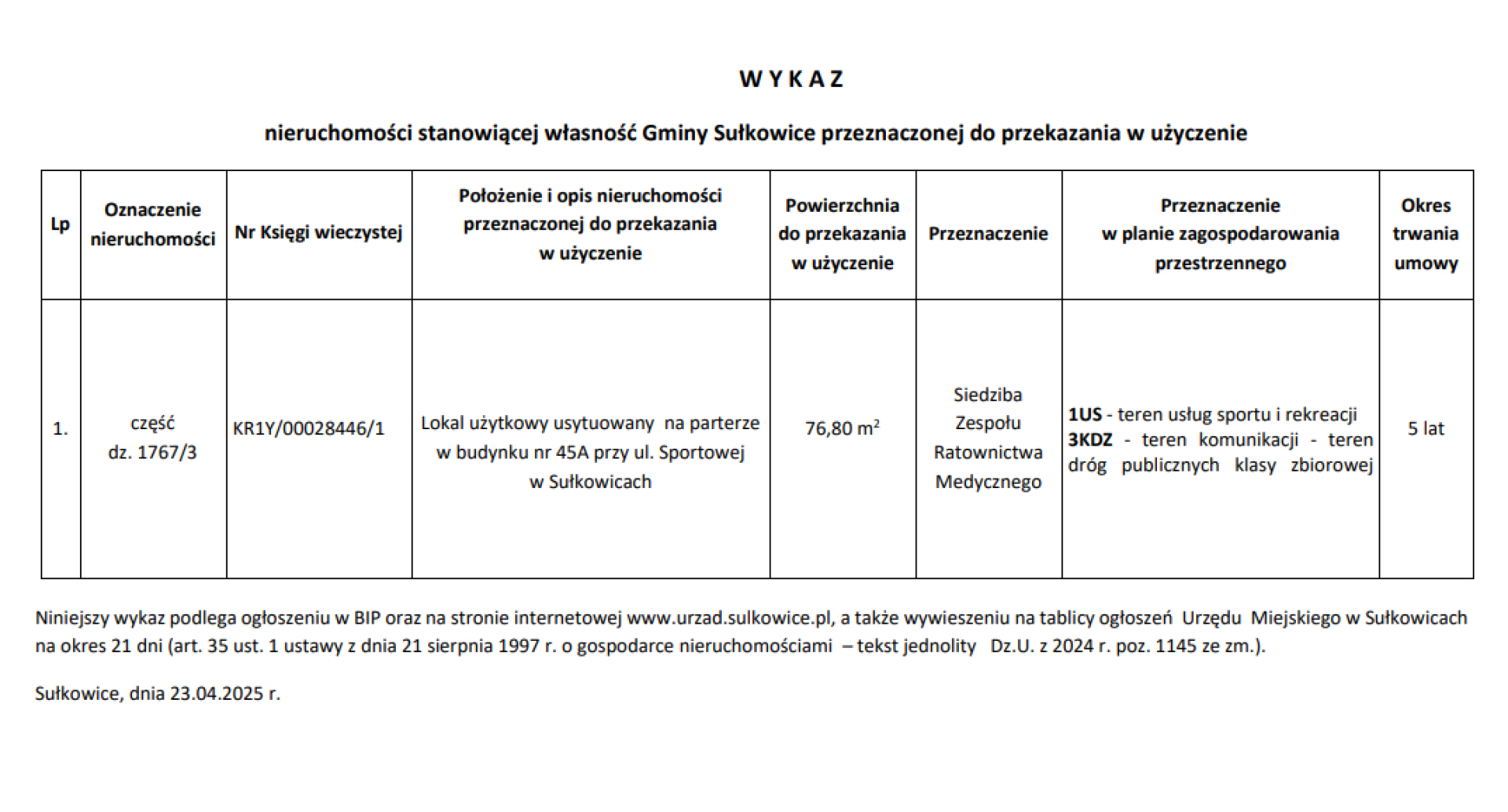 W Y K A Z nieruchomości stanowiącej własność Gminy Sułkowice przeznaczonej do przekazania w użyczenie - ul. Sportowa, budynek nr 45A