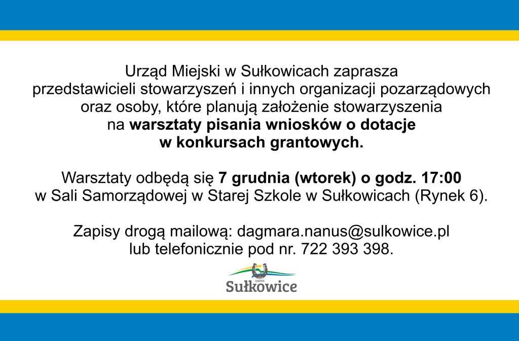 Urząd Miejski w Sułkowicach zaprasza przedstawicieli stowarzyszeń i innych organizacji pozarządowych oraz tych, którzy planują założenie stowarzyszenia na warsztaty pisania wniosków o dotacje w konkursach grantowych.