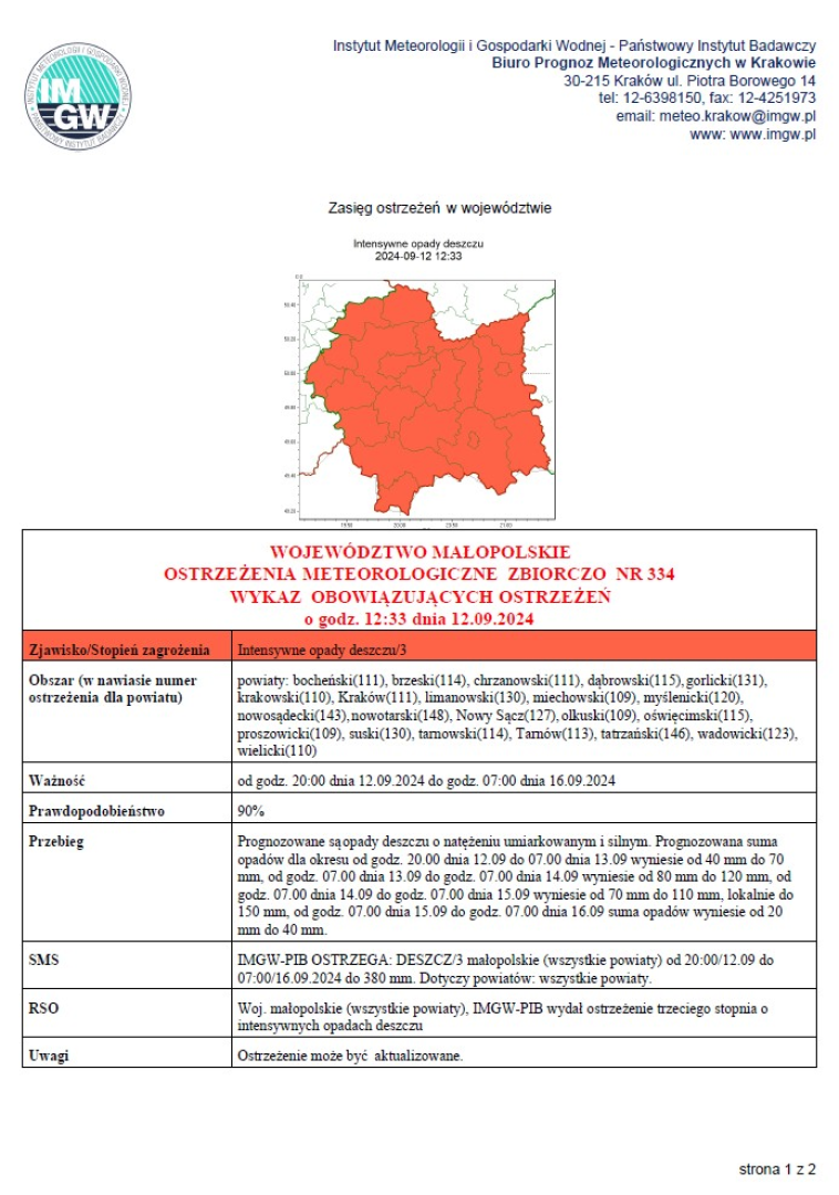 WAŻNE - Ostrzeżenie meteorologiczne 3 stopnia obowiązujące w dniach 12-16 września br.