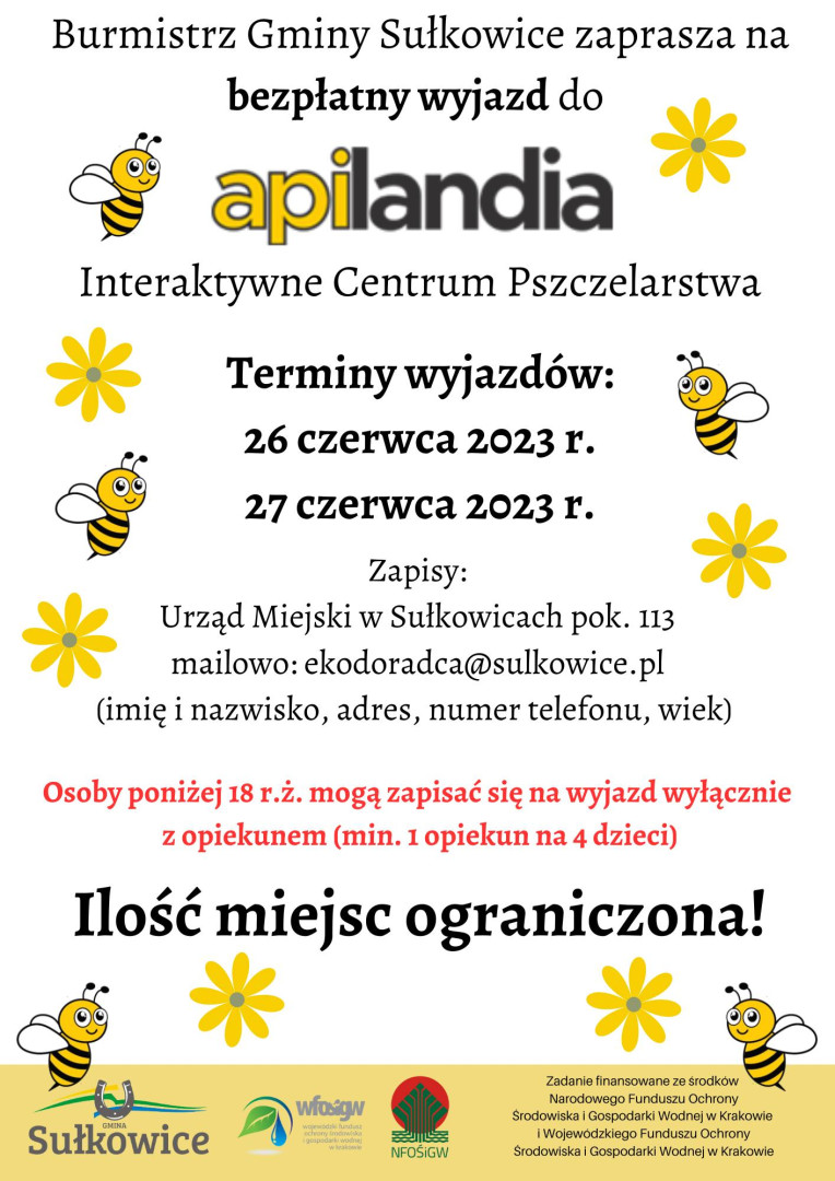 Burmistrz Gminy Sułkowice wraz z Ekodoradcami Urzędu Miejskiego w Sułkowicach zapraszają Mieszkańców na bezpłatny wyjazd do Apilandii - Interaktywnego Centrum Pszczelarstwa w Kleczy Dolnej.