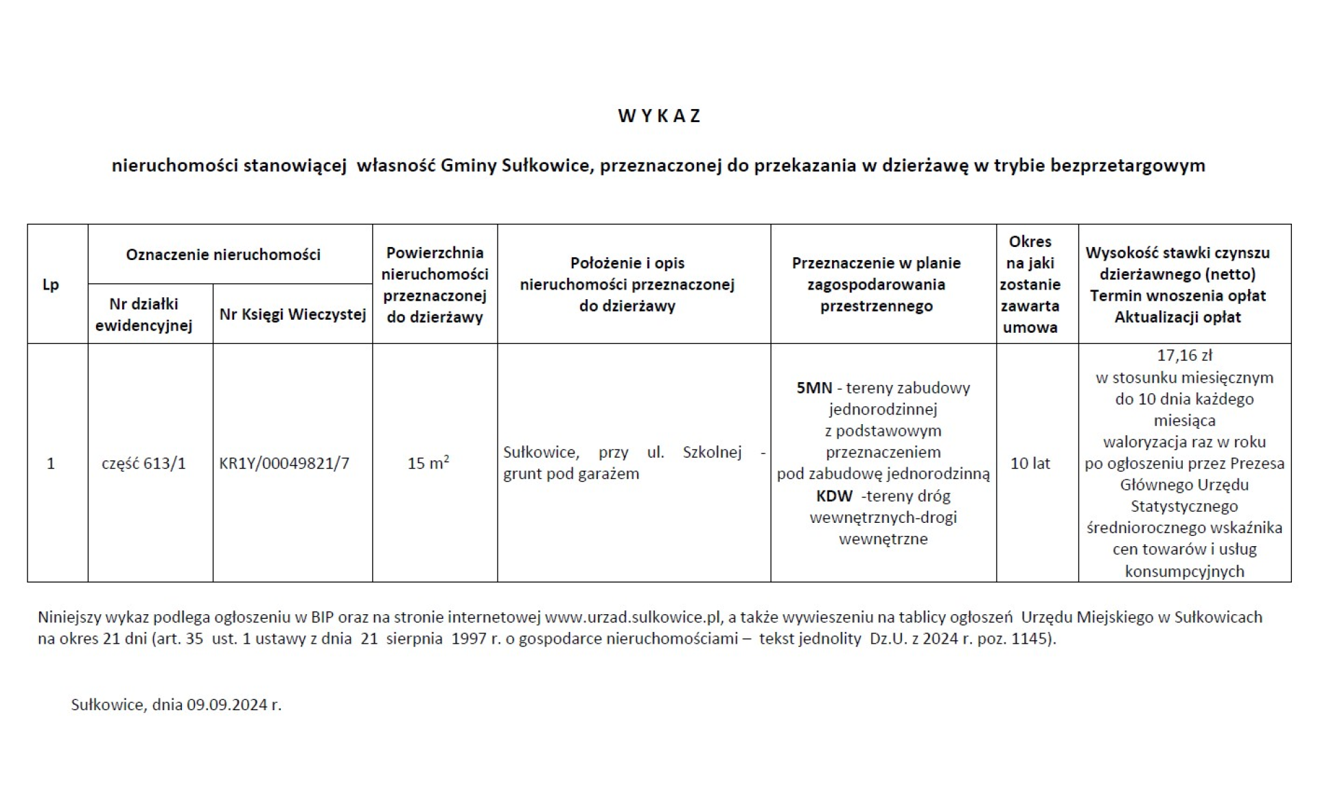 Wykaz nieruchomości stanowiącej własność Gminy Sułkowice, przeznaczonej do przekazania w dzierżawę w trybie bezprzetargowym.