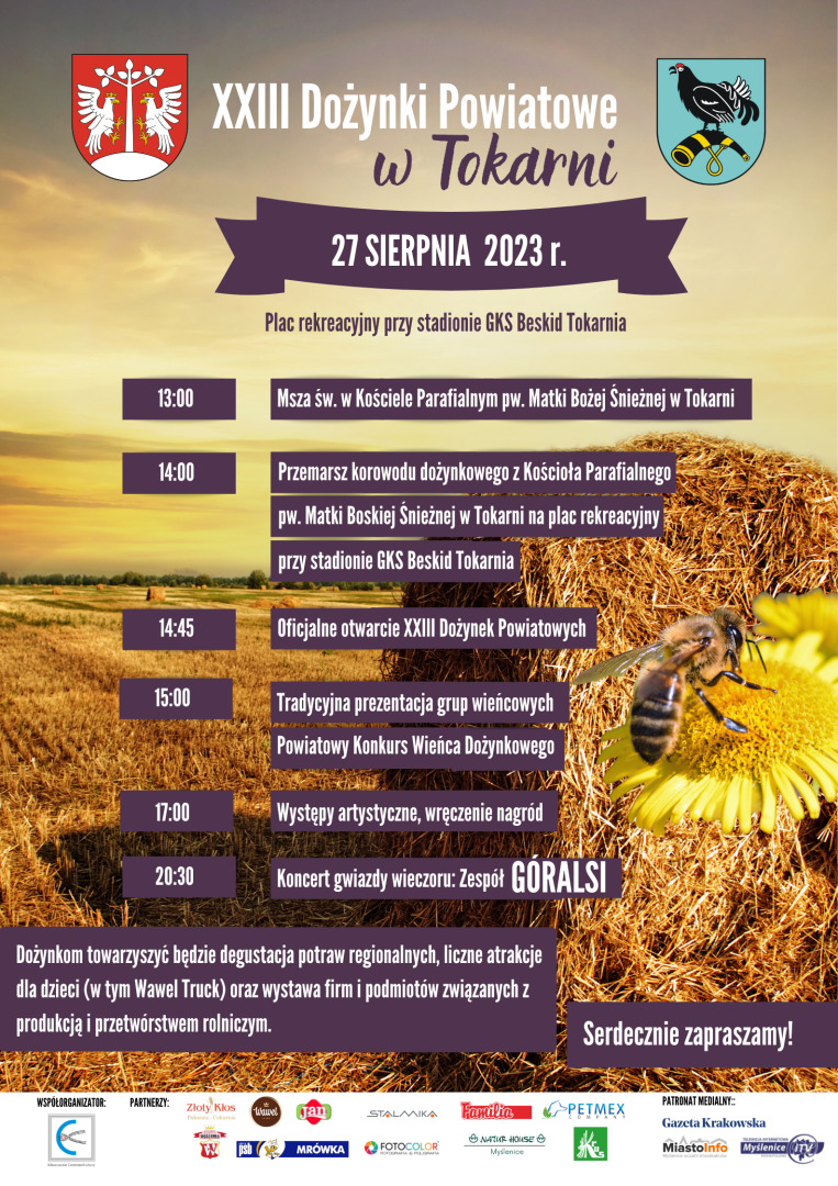 Starosta Myślenicki Józef Tomal oraz Wójt Gminy Tokarnia Marek Kluska serdecznie zapraszają na XXIII Dożynki Powiatowe, które odbędą się dnia 27 sierpnia (niedziela) w Tokarni.