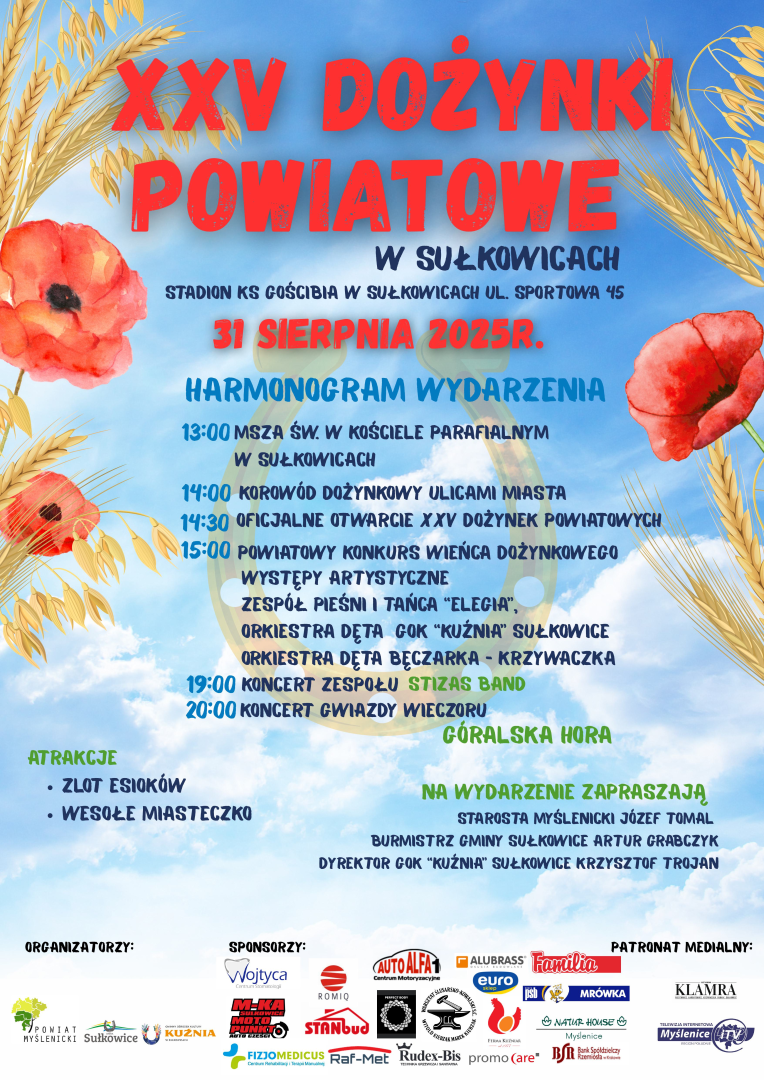 Starosta myślenicki Józef Tomal, Burmistrz Gminy Sułkowice Artur Grabczyk oraz Dyrektor GOK “Kuźnia” Krzysztof Trojan zapraszają na XXV Dożynki Powiatowe, które odbędą się 31 sierpnia 2025 r. w Sułkowicach na stadionie KS Gościbia Sułkowice. To wyjątkowe święto plonów będzie okazją do wspólnego świętowania, podziękowania rolnikom za ich trud oraz spędzenia czasu w atmosferze tradycji, muzyki i dobrej zabawy.