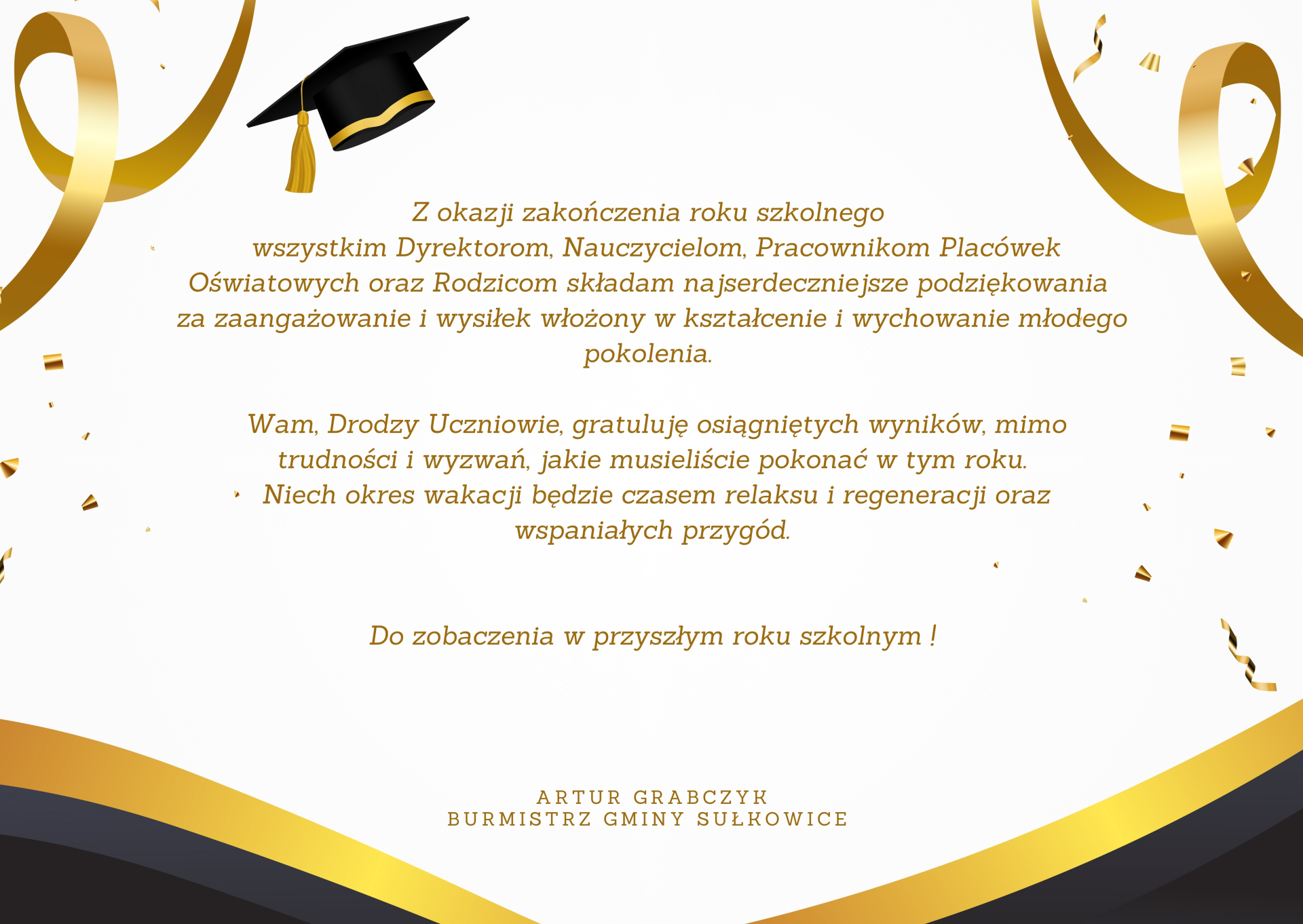 Z okazji zakończenia roku szkolnego wszystkim Dyrektorom, Nauczycielom, Pracownikom Placówek Oświatowych oraz Rodzicom składam najserdeczniejsze podziękowania za zaangażowanie i wysiłek włożony w kształcenie i wychowanie młodego pokolenia.