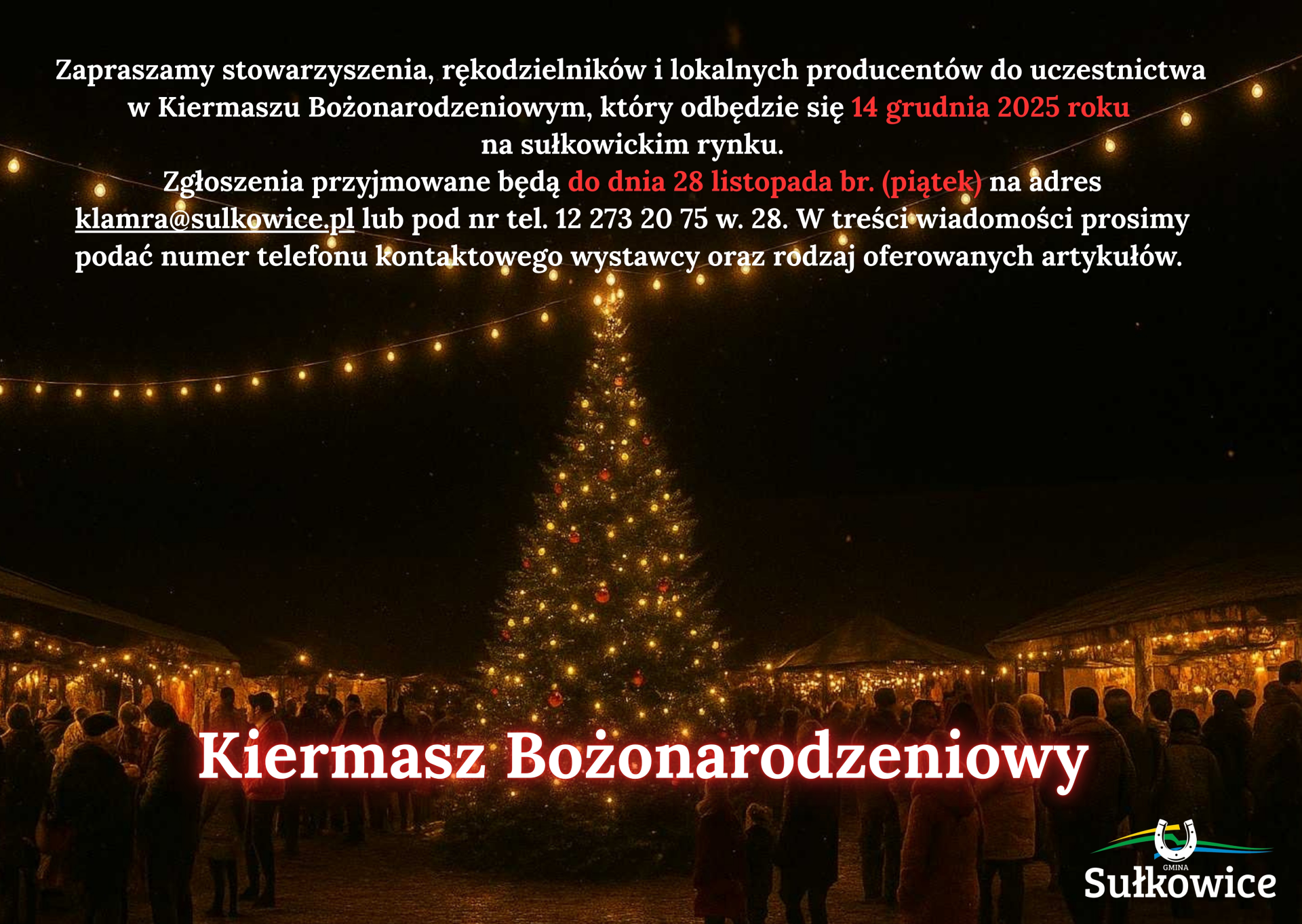 Zapraszamy stowarzyszenia, rękodzielników i lokalnych producentów do uczestnictwa w Kiermaszu Bożonarodzeniowym, który odbędzie się 14 grudnia 2025 roku na sułkowickim rynku.