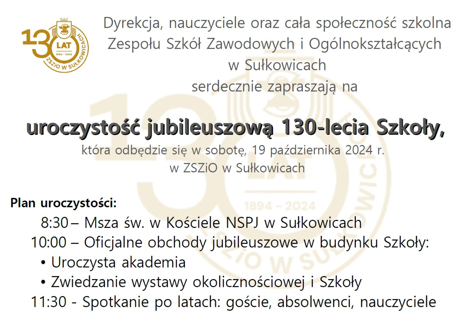 Zaproszenie na uroczystość -130 lat ZSZiO w Sułkowicach