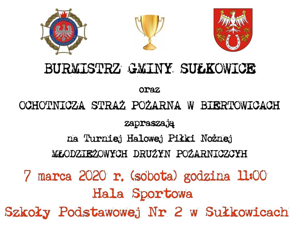 Już w najbliższą sobotę, 7 marca o godz. 11:00 w hali sportowej Szkoły Podstawowej nr 2 w Sułkowicach odbędzie się Turniej Halowej Piłki Nożnej Młodzieżowych Drużyn Pożarniczych. Zachęcamy do wsparcia i kibicowania swoim drużynom.