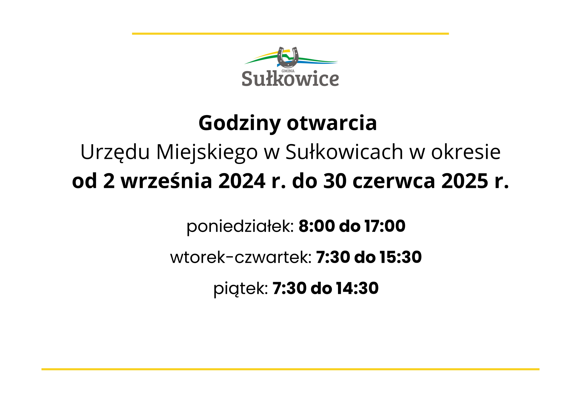 Zmiana godzin otwarcia Urzędu Miejskiego w Sułkowicach w okresie od 2 września 2024 r. do 30 czerwca 2025 r,
