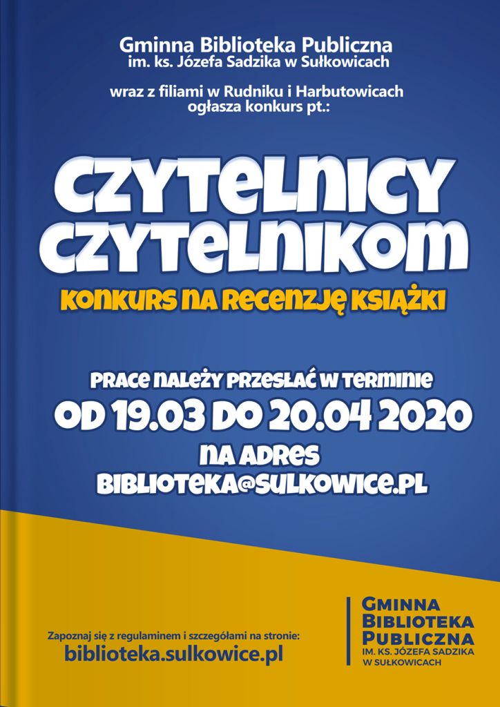 Obecny czas to dla wielu z nas okazja do przeczytania ciekawej książki. Wszystkich, którzy na taką trafili, zachęcamy do napisania recenzji i przesłania jej drogą mailową na adres Gminnej Biblioteki Publicznej w Sułkowicach biblioteka@sulkowice.pl.
